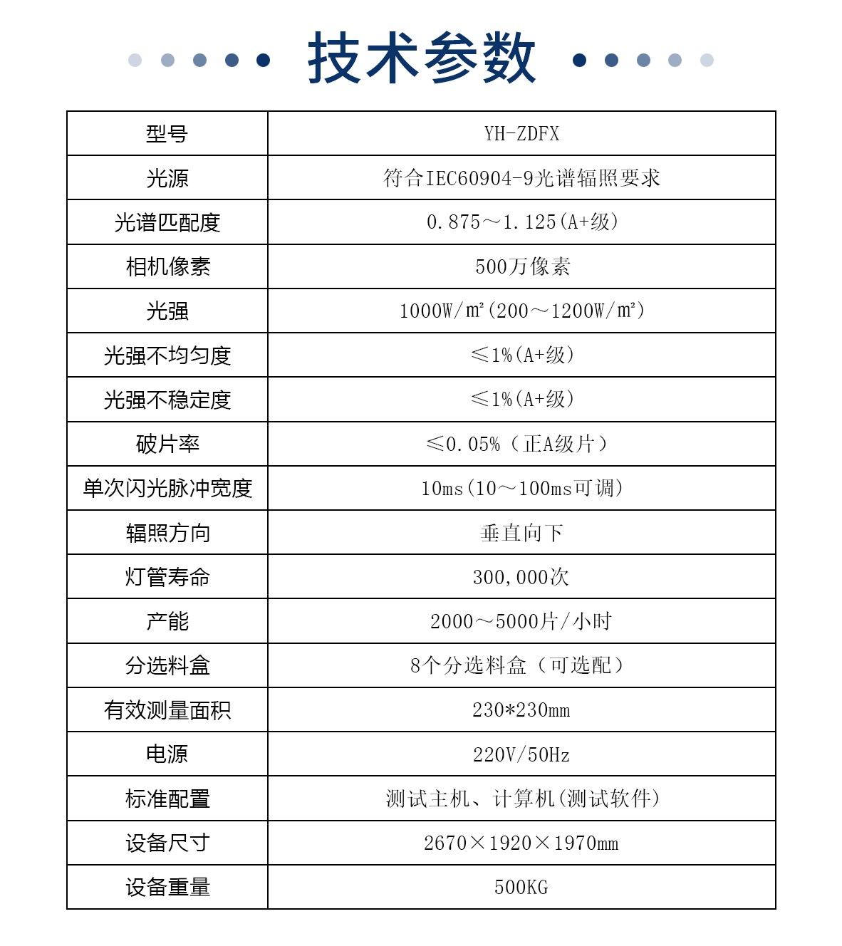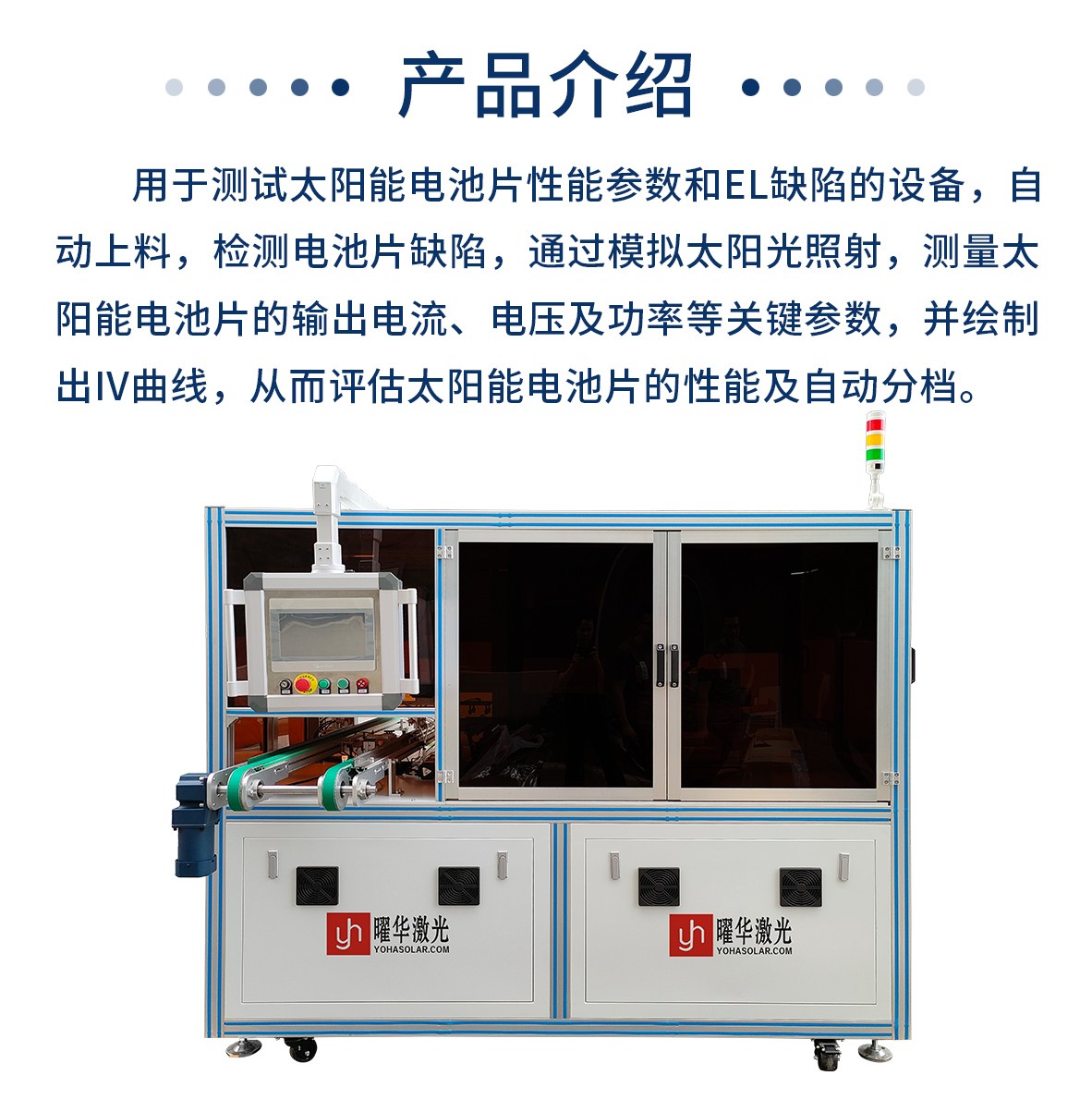 用于测试太阳能电池片性能参数和EL缺陷的设备,自动上料,检测电池片缺陷,通过模拟太阳光照射,测量太阳能电池片的输出电流、电压及功率等关键参数,并绘制出IV曲线,从而评估太阳能电池片的性能及自动分档。
