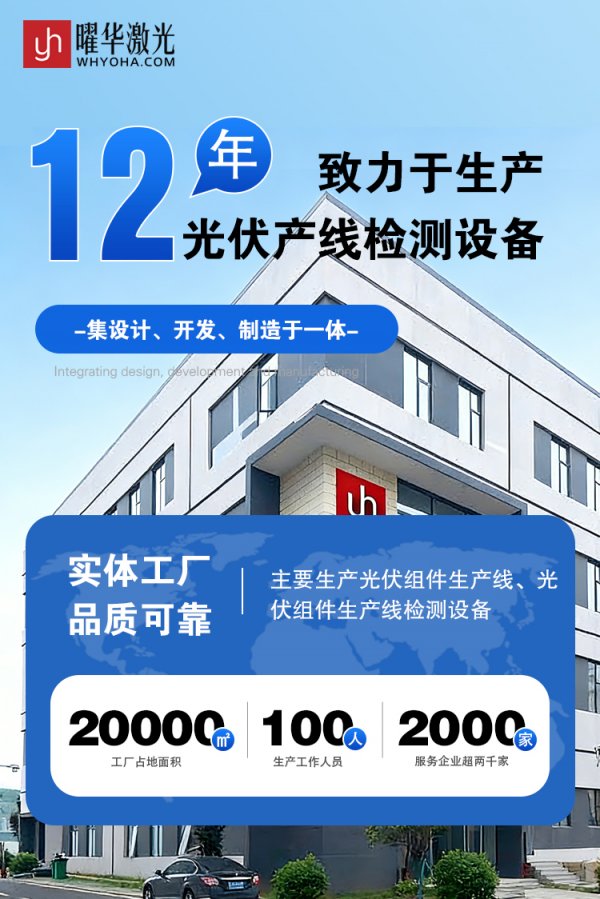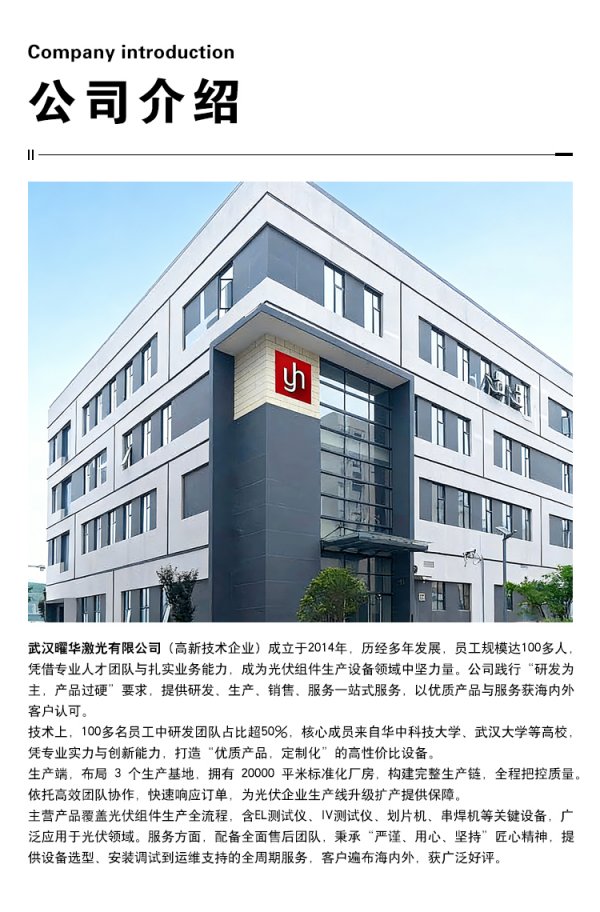 武汉曜华激光科技有限公司(高新技术企业)成立于2014年,员工规模100多人,其中研发团队占比超50%,核心成员来自华中科技大学、武汉大学等高校。公司拥有3个生产基地、20000平米标准化厂房,构建完整生产链,主营光伏组件生产全流程关键设备,如EL测试仪、IV测试仪、划片机、串焊机等,并为客户提供生产线解决方案与全周期服务,产品与服务获海内外广泛认可。