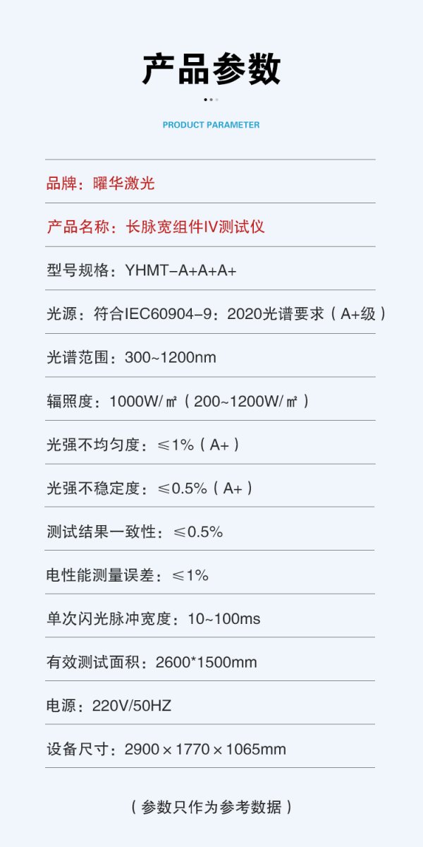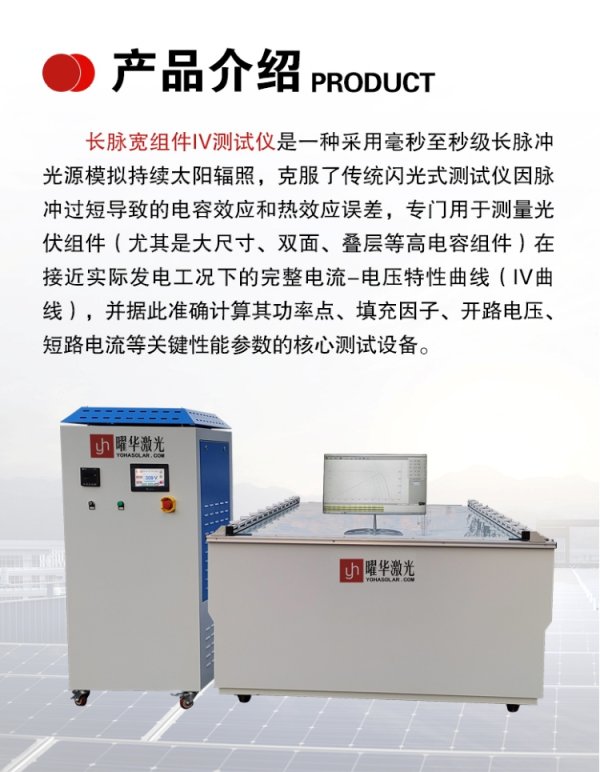 曜华激光新能源生产和销售长脉宽组件IV测试仪。为了满足不同客户的产能需求,曜华激光提供了10-500MW不同产能的生产线设备。这些设备在自动化程度上有所不同,以适应不同客户的需求。