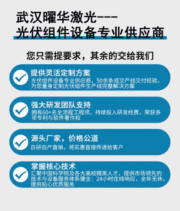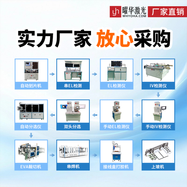 武汉曜华激光科技有限公司成立于2014年,员工规模100多人,其中研发团队占比超50%,核心成员来自华中科技大学、武汉大学等高校。公司拥有3个生产基地、20000平米标准化厂房,构建完整生产链,主营光伏组件生产全流程关键设备,如EL测试仪、IV测试仪、划片机、串焊机等,并为客户提供生产线解决方案与全周期服务,产品与服务获海内外广泛认可。