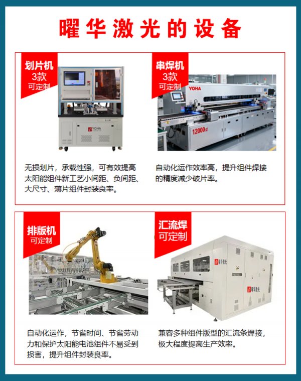 曜华激光新能源生产和销售太阳能组件生产线。为了满足不同客户的产能需求,曜华激光提供了10-500MW不同产能的生产线设备。这些设备在自动化程度上有所不同,以适应不同客户的需求。