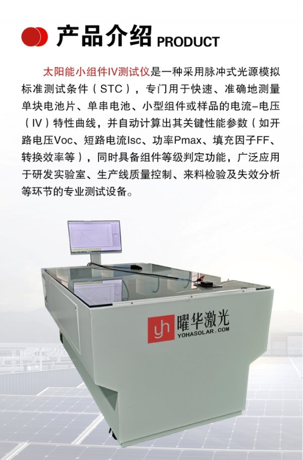 曜华激光太阳能小组件 IV 测试仪,专为小尺寸光伏组件设计,精准完成电性能与 IV 曲线测试。设备操作简便、测试稳定,可快速测量电流、电压、功率等关键参数,自动生成数据报表。适用于实验室研发、产线抽检与教学实训,体积小巧、精度高、兼容性强,是小组件品质管控的理想设备。
